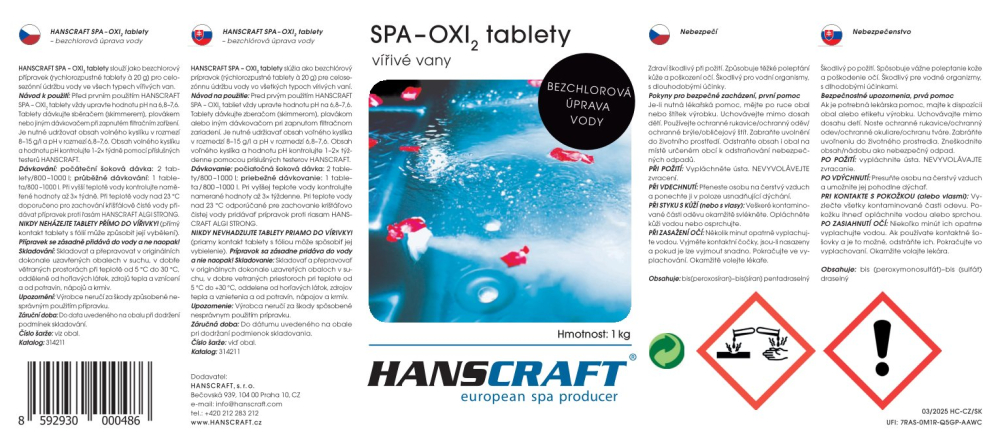 Před prvním použitím HANSCRAFT OXI2 TABLETY vždy upravte hodnotu pH na 6,8–7,6. Tablety dávkujte sběračem (skimmerem), plovákem nebo jiným dávkovačem při zapnutém filtračním zařízení. Je nutné udržovat obsah volného kyslíku v rozmezí 8–15 g/l a pH v rozmezí 6,8–7,6. Obsah volného kyslíku a hodnotu pH kontrolujte 1–2× týdně pomocí příslušných testerů HANSCRAFT.