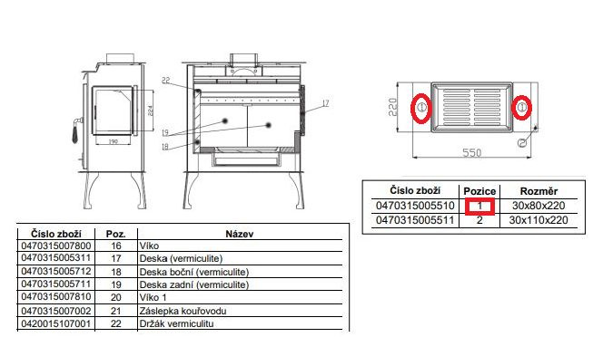 Objednávkový kod - starý - 470315005510 pro položku Cihla (šamot) 30x80x220 ------------ Počet potřebných kusů do kamen nebo krbu : 2